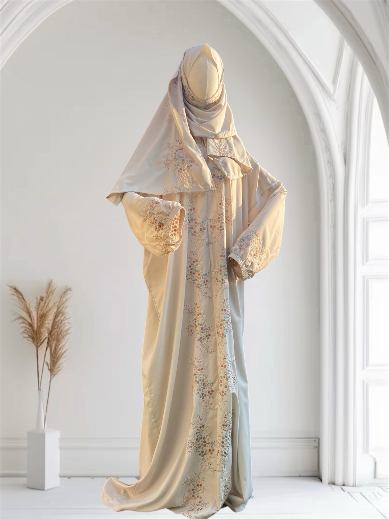 وقار ( نساء) – ثوب صلاة Wiqār Floral – Women’s Prayer Garment سحاب Zip Color Soft Cream